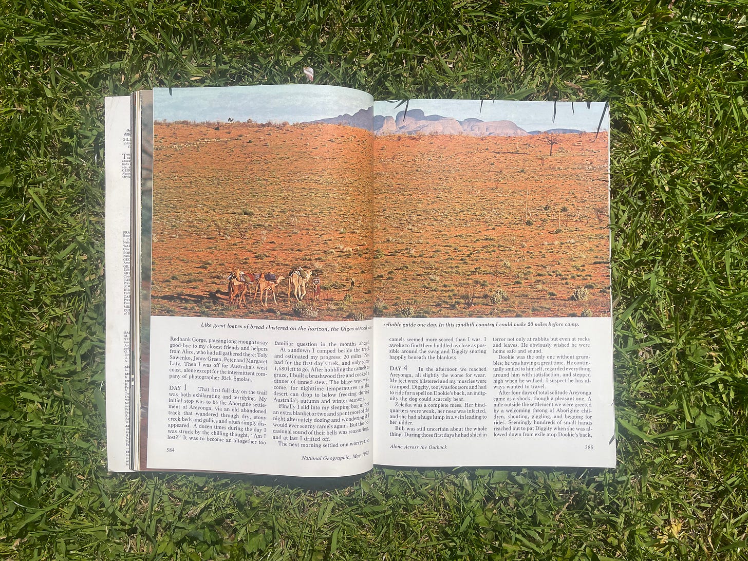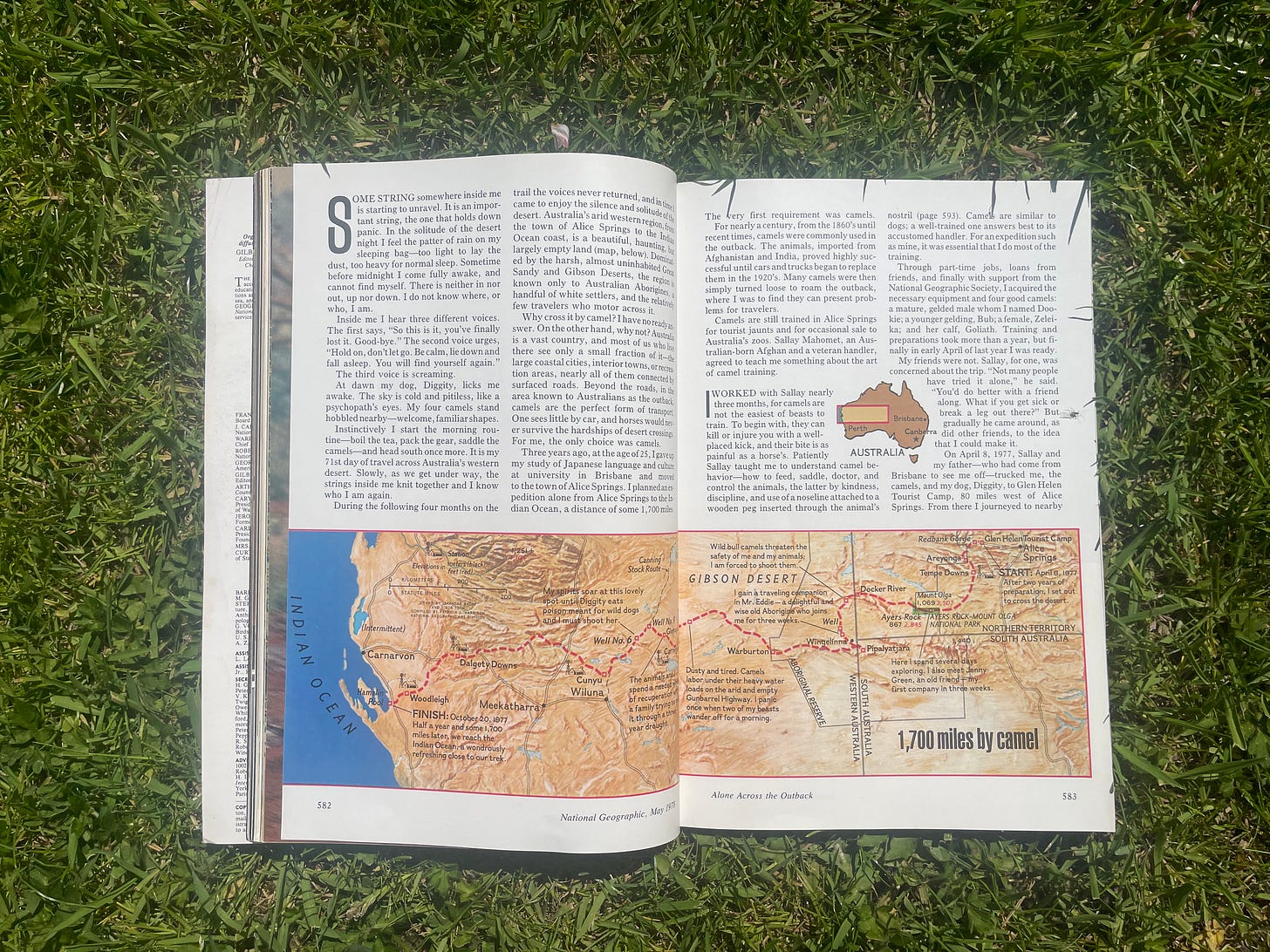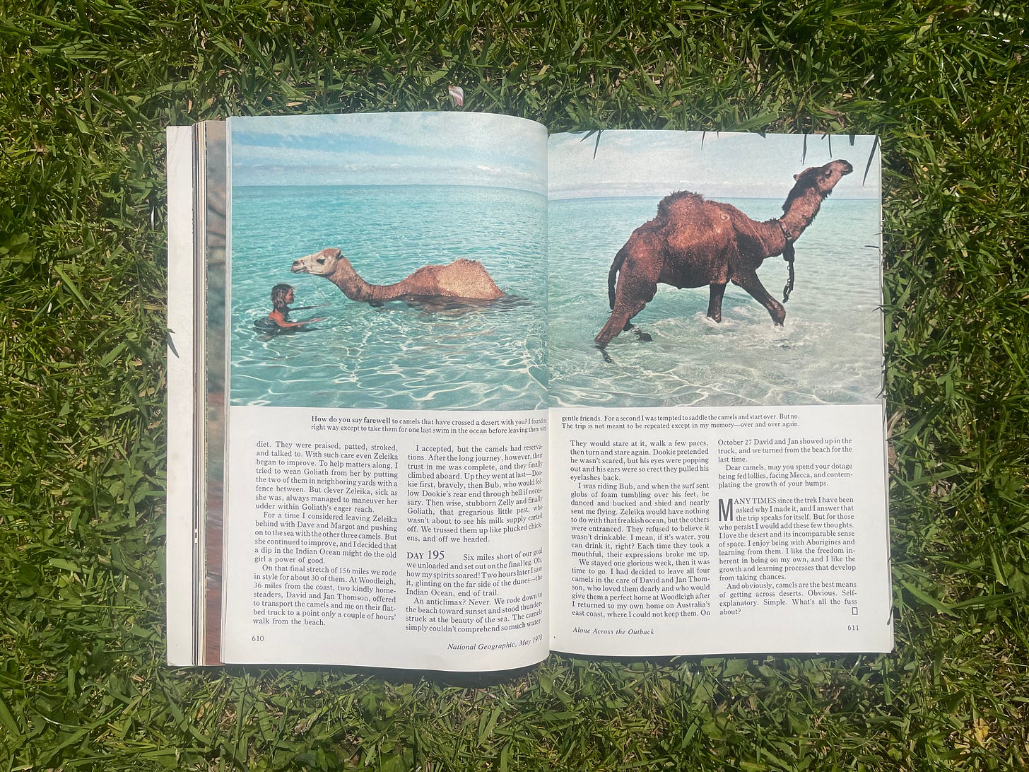 One of the issues I kept is May 1978 – which features the story of Robyn Davidson’s 1,700-mile trek from Alice Springs to the Indian Ocean.